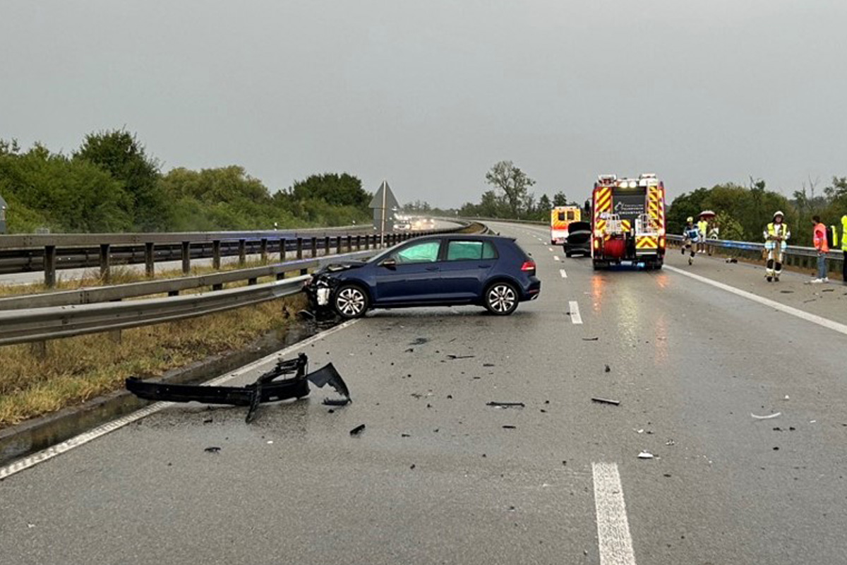 Wenige Meter hinter der ersten Unfallstelle kam zeitgleich ein 52jähriger Mann mit seinem VW Golf aufgrund von Aquaplaning ins Schleudern und prallte gegen die Mittelleitplanke.