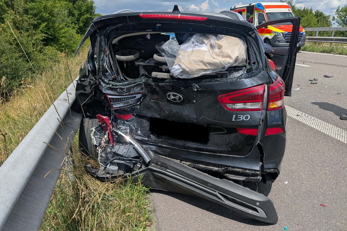 Ein Kleintransporter fuhr am 26. Juli 2025 in einen Pkw auf, der wegen eines Baustellenstaus abbremste. Der Pkw mit einem Ehepaar und zwei Kindern wurde in die Leitplanke geschleudert. Alle Insassen erlitten Verletzungen.