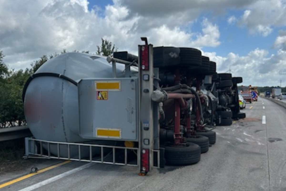 Am Mittwoch, 6. August 2025, kippte auf der A7 bei Egestorf ein mit Zucker beladener Lkw in einer Baustellenverschwenkung um. Der Fahrer wurde verletzt.