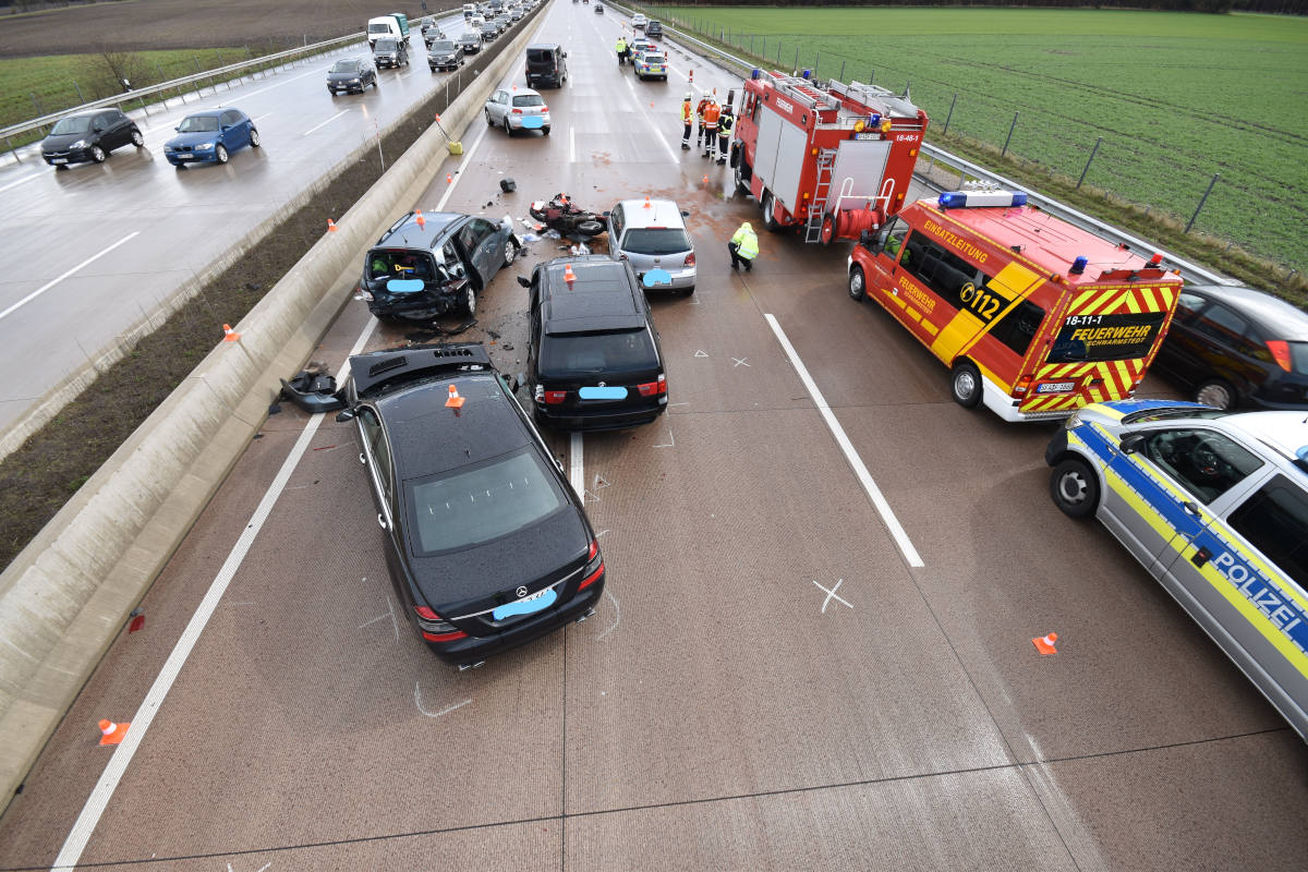 Bei einem der Unfälle waren sechs PKW sowie ein Krad beteiligt. Alle Fahrzeuge fuhren hintereinander, wobei der hinten fahrende PKW Daimler auf das Stauende auffuhr und die PKW ineinanderschob. Ein 35-jähriger BMW-Kradfahrer bemerkte das Szenario augenscheinlich zu spät und versuchte noch, auszuweichen. Dabei geriet er ins Schleudern und stürzte. Er verstarb noch an der Unfallstelle.