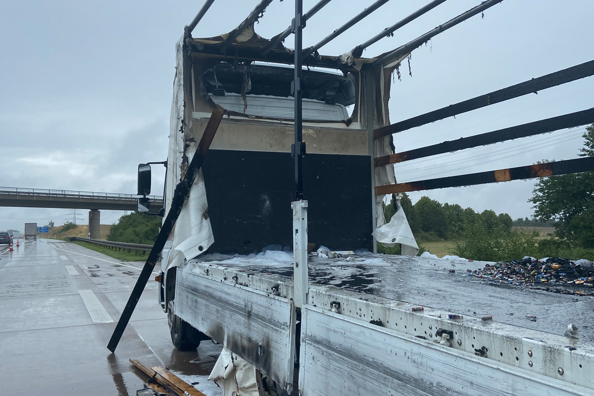 Das Fahrzeug ist nicht mehr fahrbereit. Außerdem wurde die Ladung durch das Feuer teilweise beschädigt.