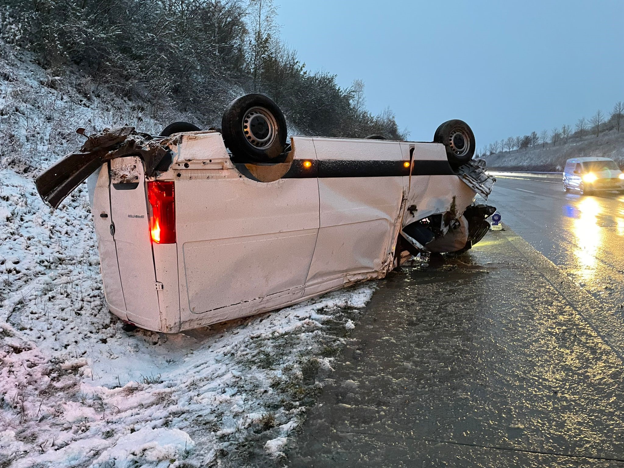 Ein Transporter überschlug sich heute früh auf der A71 gleich mehrfach. Der 40-jährige Fahrer verlor aufgrund von unangepasster Geschwindigkeit bei glatter Fahrbahn die Kontrolle über sein Fahrzeug.