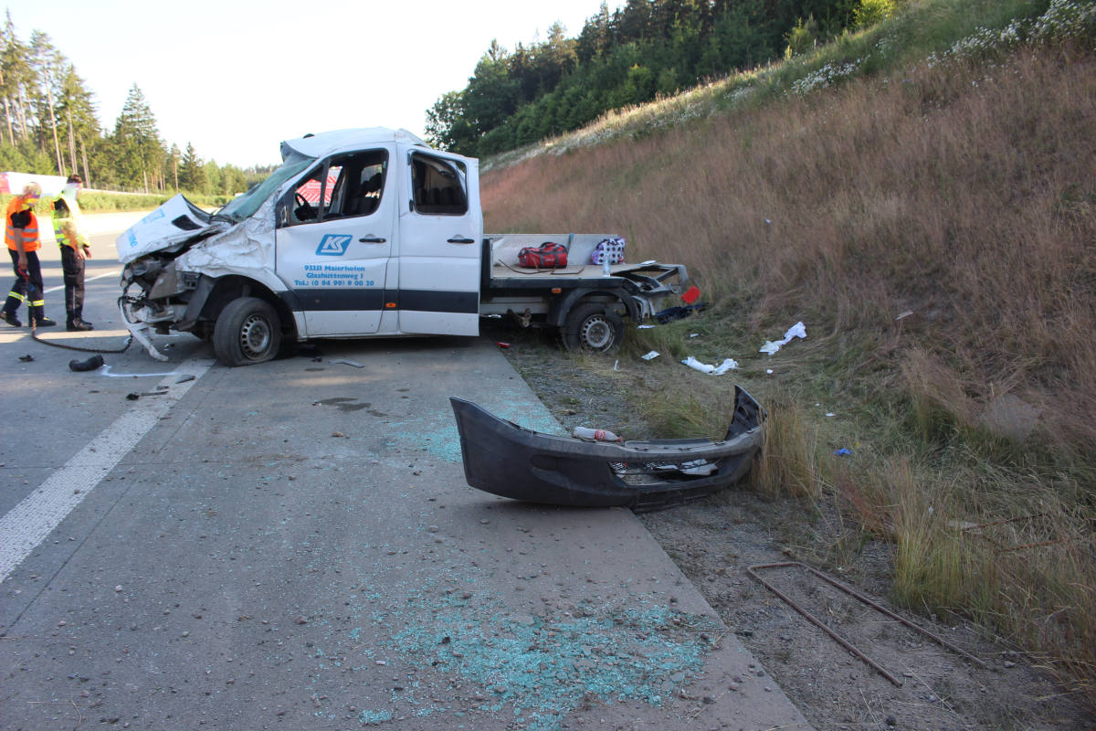Aufgrund eines Reifenplatzers verlor der 43-jährige kosovarische Fahrer eines Mercedes Sprinters auf der linken Spur die Kontrolle über sein Fahrzeug. Der Transporter schleuderte nach rechts über alle Fahrspuren und überschlug sich nachfolgend im angrenzenden Böschungsbereich. Das Fahrzeug kam anschließend quer zur Fahrtrichtung auf den Rädern zum Stehen. Alle 6 Insassen (43, 19, 40, 41, 47, 49 / männlich, kosovarisch) wurden dabei schwer verletzt.
