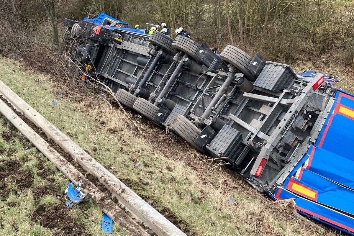 Aus bisher ungeklärter Ursache kam der Sattelzug nach rechts von der Fahrbahn ab, durchbrach die Leitplanke und rutschte eine Böschung hinunter. In der weiteren Folge kippte das Fahrzeug auf die rechte Fahrzeugseite. Der Fahrer wurde bei dem Verkehrsunfall im Fahrzeug eingeklemmt.