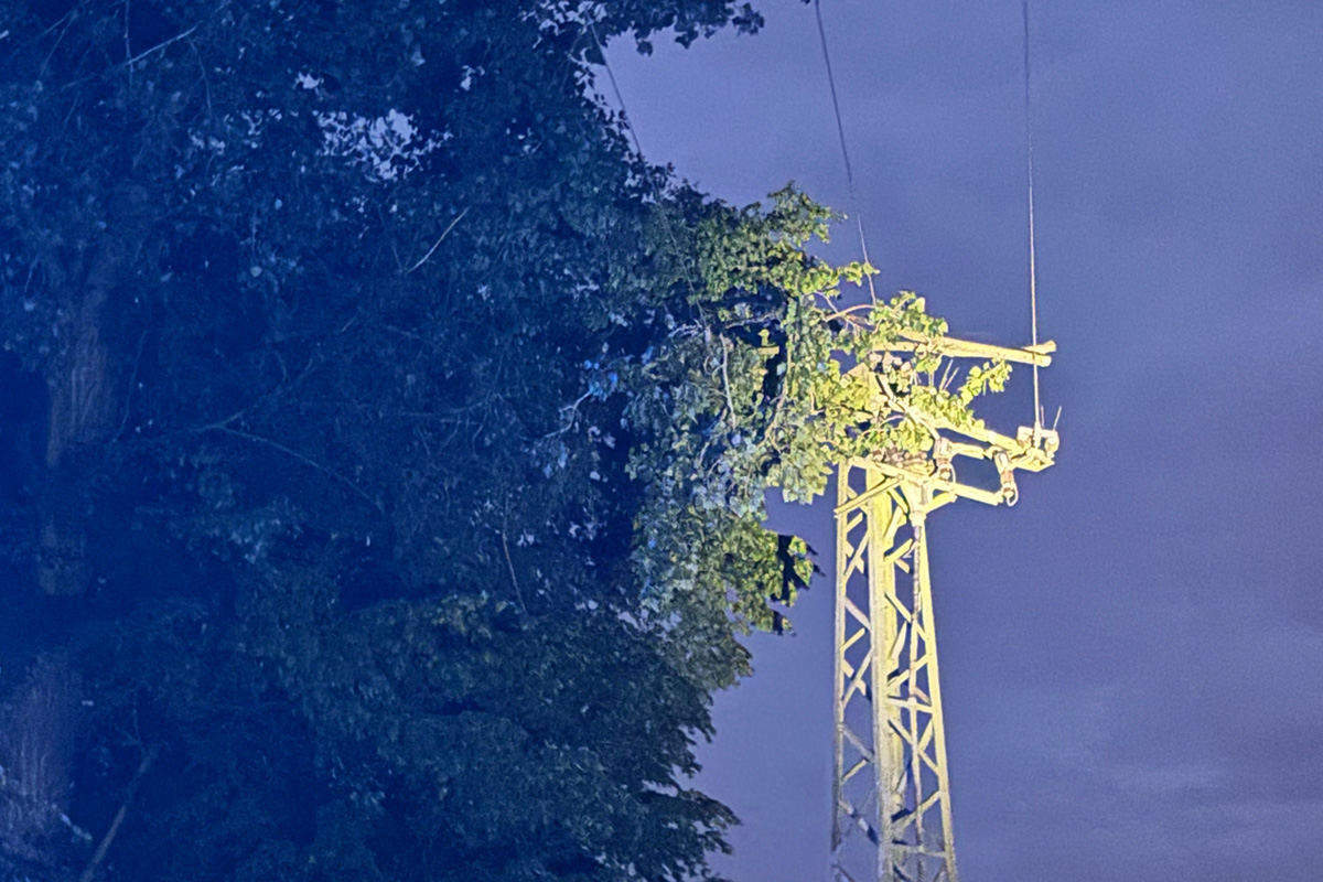 Am Samstag, 19. Juli 2025, gegen 22:27 Uhr, waren in der Alten Poststraße in Alpen mehrere dicke Äste auf eine Stromleitung und einen Mast gefallen.