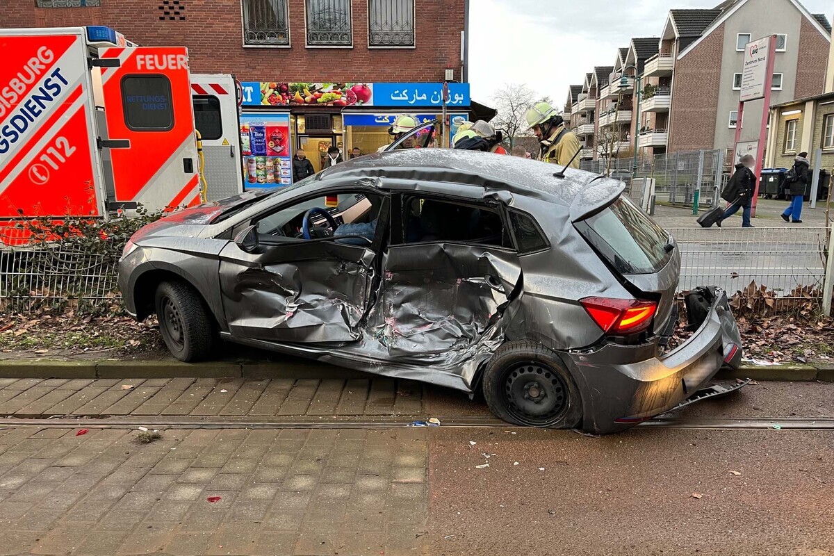 Der Straßenbahnfahrer (37) konnte trotz Gefahrenbremsung einen Zusammenstoß mit der linken Fahrzeugseite des Seat nicht mehr verhindern. Durch die Wucht des Aufpralls wurde das Auto mehrere Meter in Richtung der Haltestelle Hamborn-Rathaus geschoben und so stark beschädigt, dass die Feuerwehr die Insassen befreien musste.