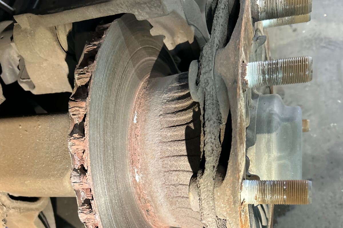 Die Bremsbeläge der hinteren Achsen waren vollständig abgefahren, die Bremsscheiben erheblich abgenutzt, sodass buchstäblich nur noch Metall auf Metall bremste.