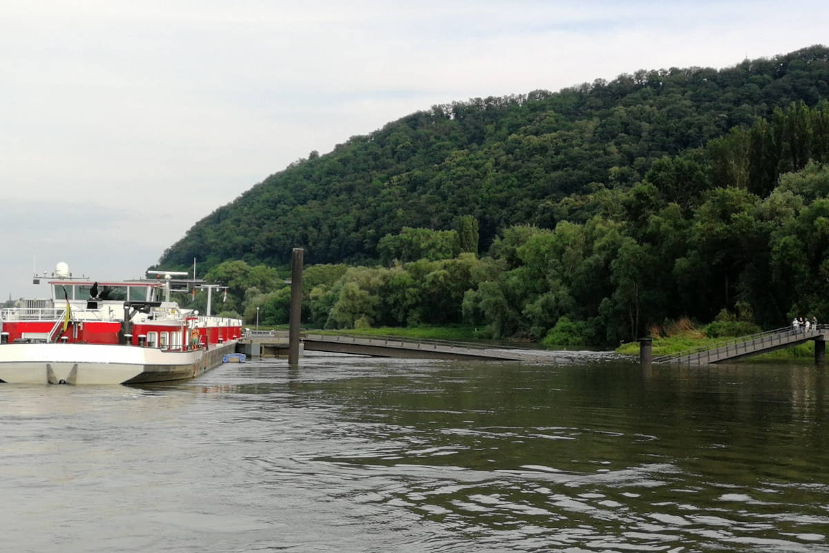 Am 26.06.2021 gegen 18:30 Uhr fuhr ein zu Berg fahrendes Tankschiff in die zum Geysir in Andernach gehörende Steganlage.