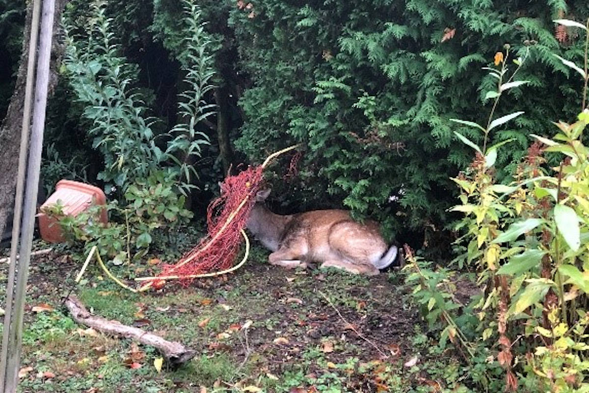 Am Freitag, den 08.10.21 wurde die Polizei Andernach darüber informiert, dass sich ein Junghirsch in einem Garten der Hauptstraße verirrt habe. Ungewöhnlich sei, dass das Tier eine Art Netz oder ähnliches im Geweih hängen habe.