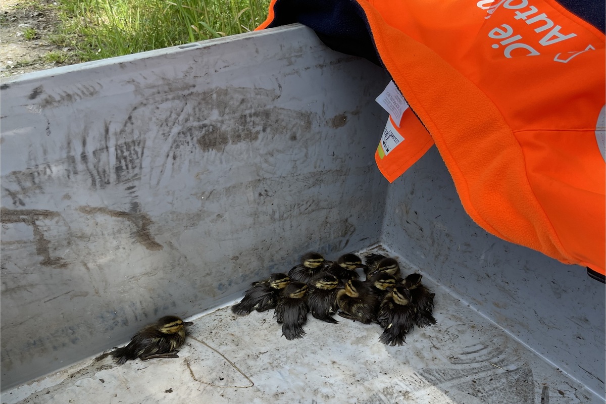 Beteiligt an der Einfangaktion waren die Autobahnmeisterei, ein Abschleppdienst sowie die Polizei. Die Entenmama flog leider davon und kam bis 15.00 Uhr auch nicht mehr zurück. Die Entenküken wurden wohlbehalten in ein Tierheim gebracht.