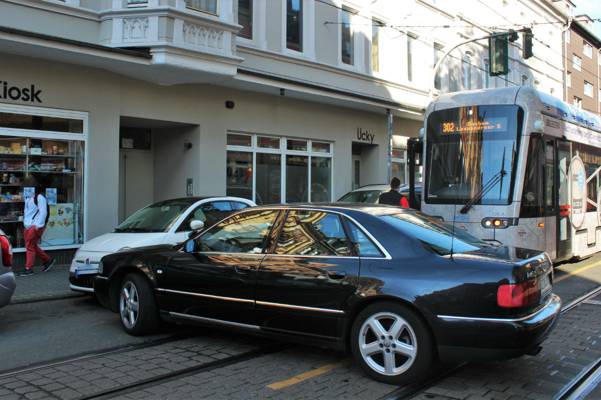 Seltsamer Unfall auf der Bochumer Strasse in Höhe Bergmannstrasse: Die Polizeibeamten wurden dort am Sonntagmorgen, 2.6.2019 um 8.00 Uhr von einem Strassenbahnfahrer alarmiert. Dieser hatte seine Bahn stoppen müssen, weil ein PKW quer auf der Fahrbahn stand, die Gleise blockierte und ein anderes Auto beschädigt hatte. Personen waren nicht vor Ort.