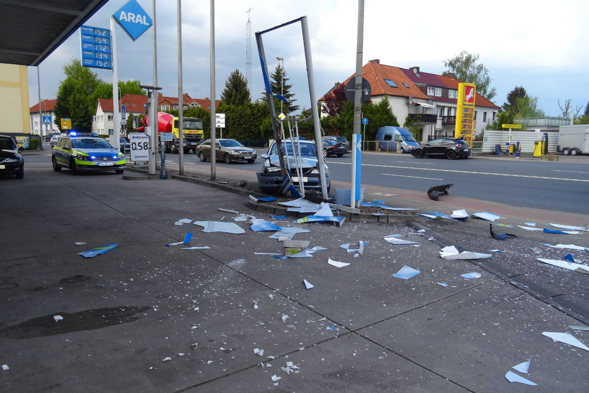 Im Einmündungsbereich kam es dann zum Zusammenstoss der beiden Fahrzeuge. Durch die Wucht des Aufpralls wurde der Opel gegen ein etwa 5m hohes Tankstellenleuchtschild geschleudert und kam dort zum Stehen.