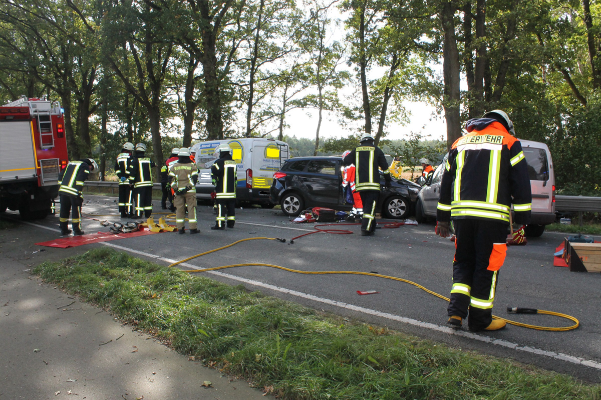 Am Freitagmittag (26.09.2025) kam es auf der B71 zwischen Deinstedt Bahnhof und Bevern zu einem schweren Verkehrsunfall mit einem Lkw, einem Kleintransporter und drei Pkw. Fünf Personen wurden verletzt, darunter drei schwer. Eine Frau wurde mit dem Rettungshubschrauber ins Krankenhaus geflogen.
