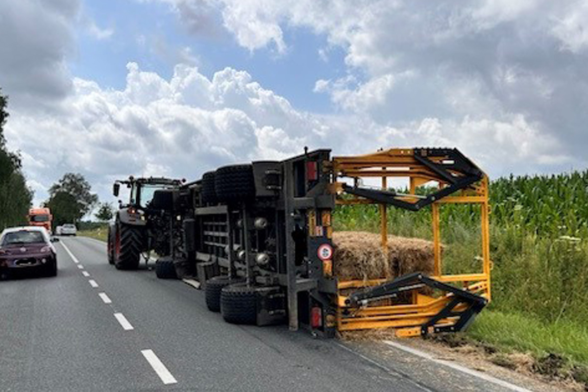 Dabei fiel der Anhänger um. Die Heuballen, die auf dem Anhänger geladen waren, verteilten sich auf beiden Fahrbahnen.