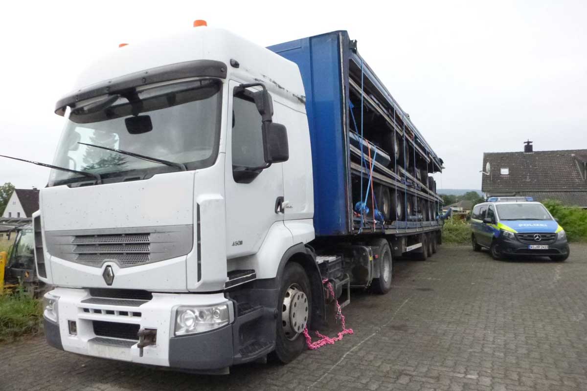 Nachdem die Mängelliste des verkehrsuntauglichen Sattelzuges immer länger und nach einer Weile abgeschlossen wurde, widmete sich die Funkstreife dem Auflieger.