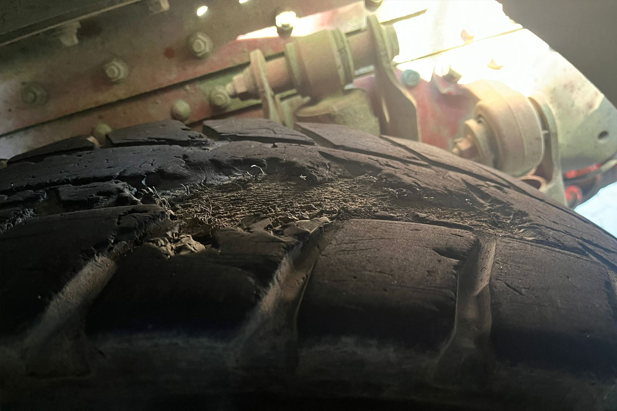 Ein Reifen der Zugmaschine wies ein großes Loch auf, sodass die Karkasse sichtbar war.