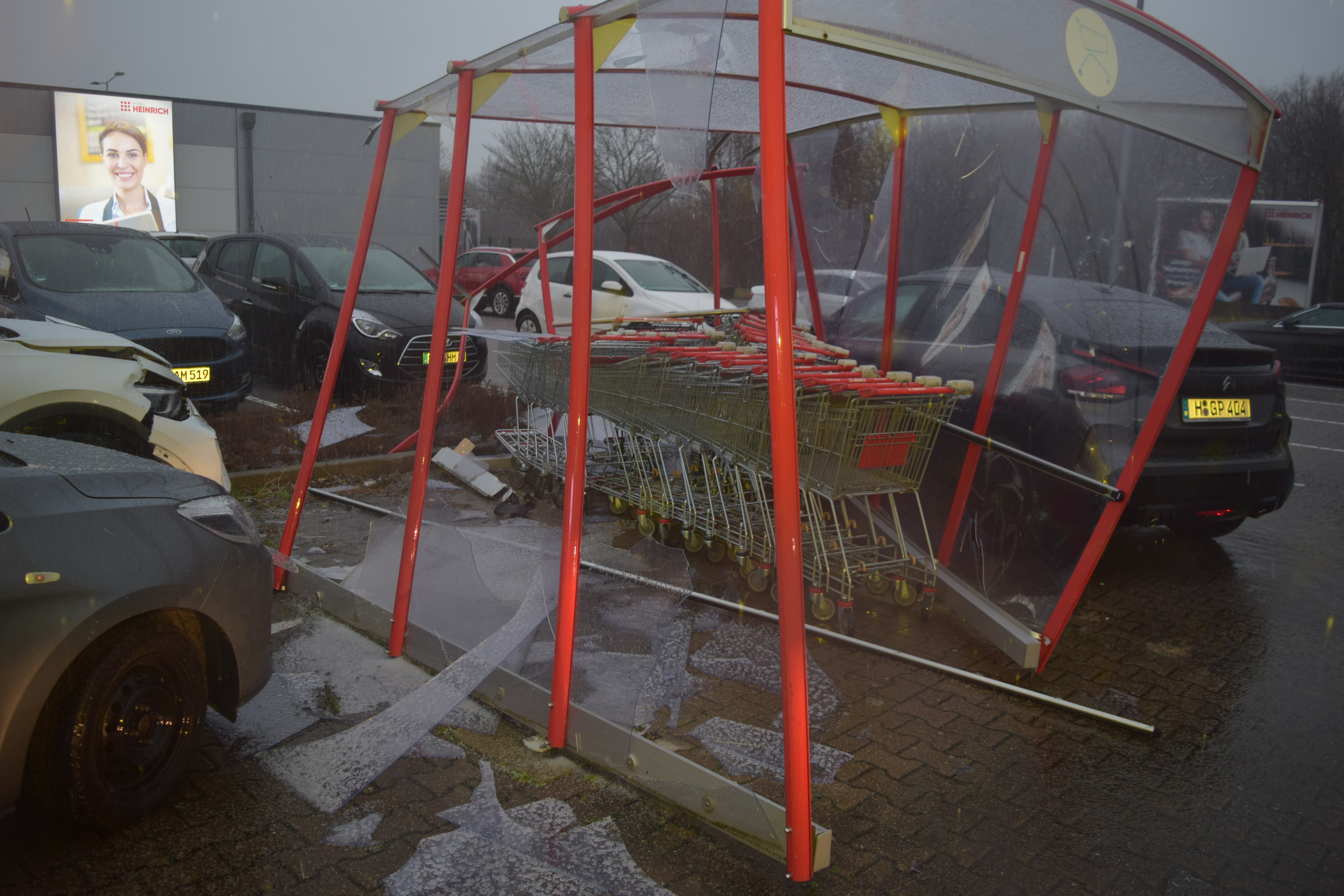 Bei der Drehung stieß das Fahrzeug gegen einen auf dem Parkplatz befindlichen Überbau für Einkaufswagen, dieser Überbau knickte ab und beschädigte ein weiteres, viertes Fahrzeug. Die Polizei schätzt den Sachschaden auf ca. 40000 Euro. Bei dem spektakulären Unfall wurde niemand verletzt.