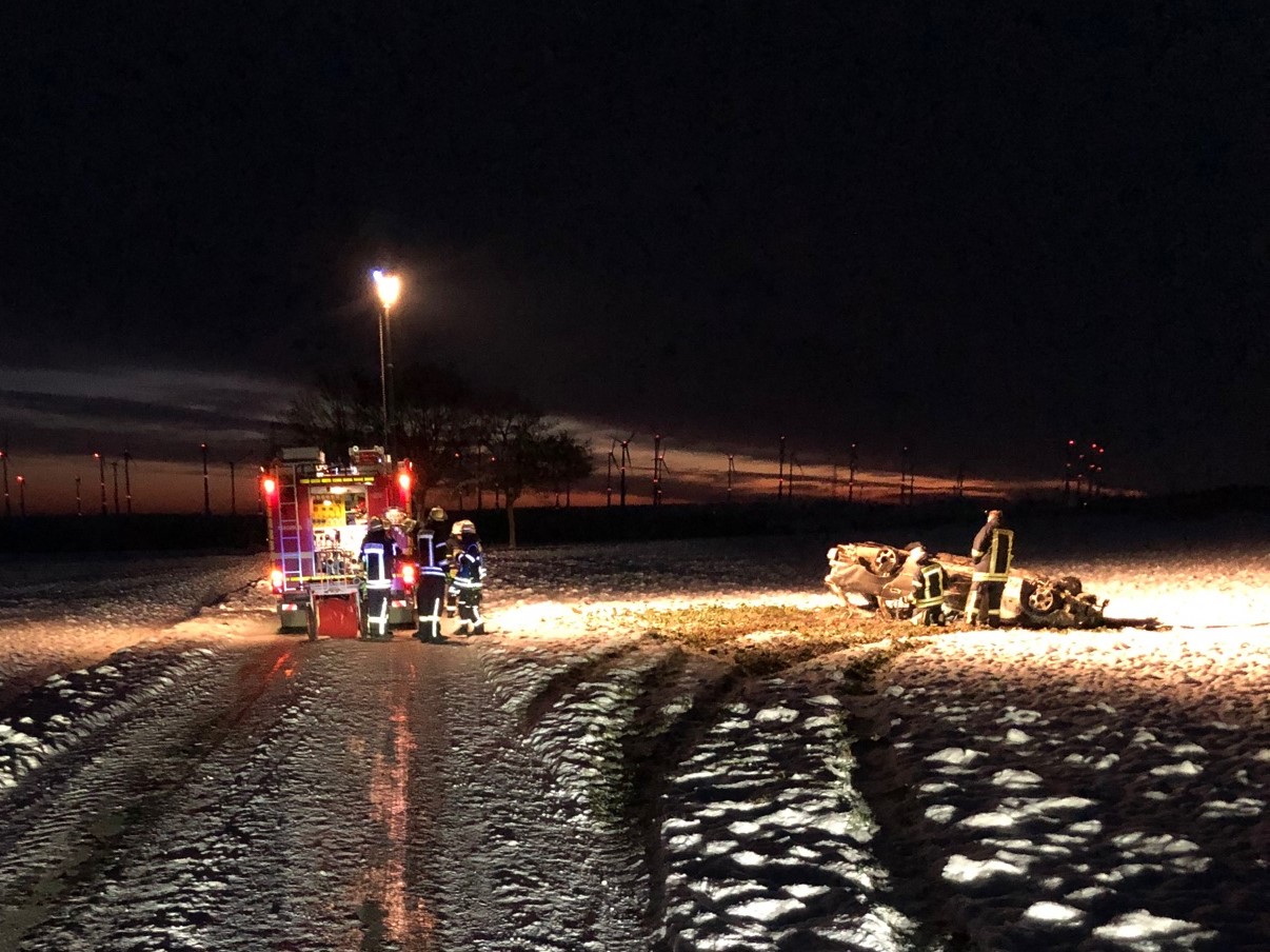 Gegen 07.00 Uhr wurde ein auf dem Dach liegender BMW auf einem Feld am Mittelweg entdeckt. Die Straße verläuft parallel zur Meerhofer Straße in Richtung Meerhof. Das Auto war ausgebrannt und glomm noch. Die Unfallzeit könnte schon Stunden zurück liegen. Personen befanden sich nicht im oder am BMW. Vom Fahrzeug führen Fußspuren im Schnee in Richtung Meerhof und dann nach rechts in Richtung Wald. Die Polizei kann nicht ausschließen, dass der Fahrer verletzt ist und sich bei der herrschenden Kälte in einem hilflosen Zustand befindet. Am Unfallort laufen Suchmaßnahmen. Ein Polizeihubschrauber ist eingesetzt.