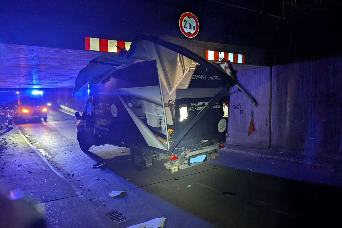 An der Bahnunterführung in der Kampstraße missachtete ein 27-jähriger Fahrer eines Transporters die Höhenbegrenzung und blieb mit seinem Fahrzeug unter der Bahnunterführung stecken.