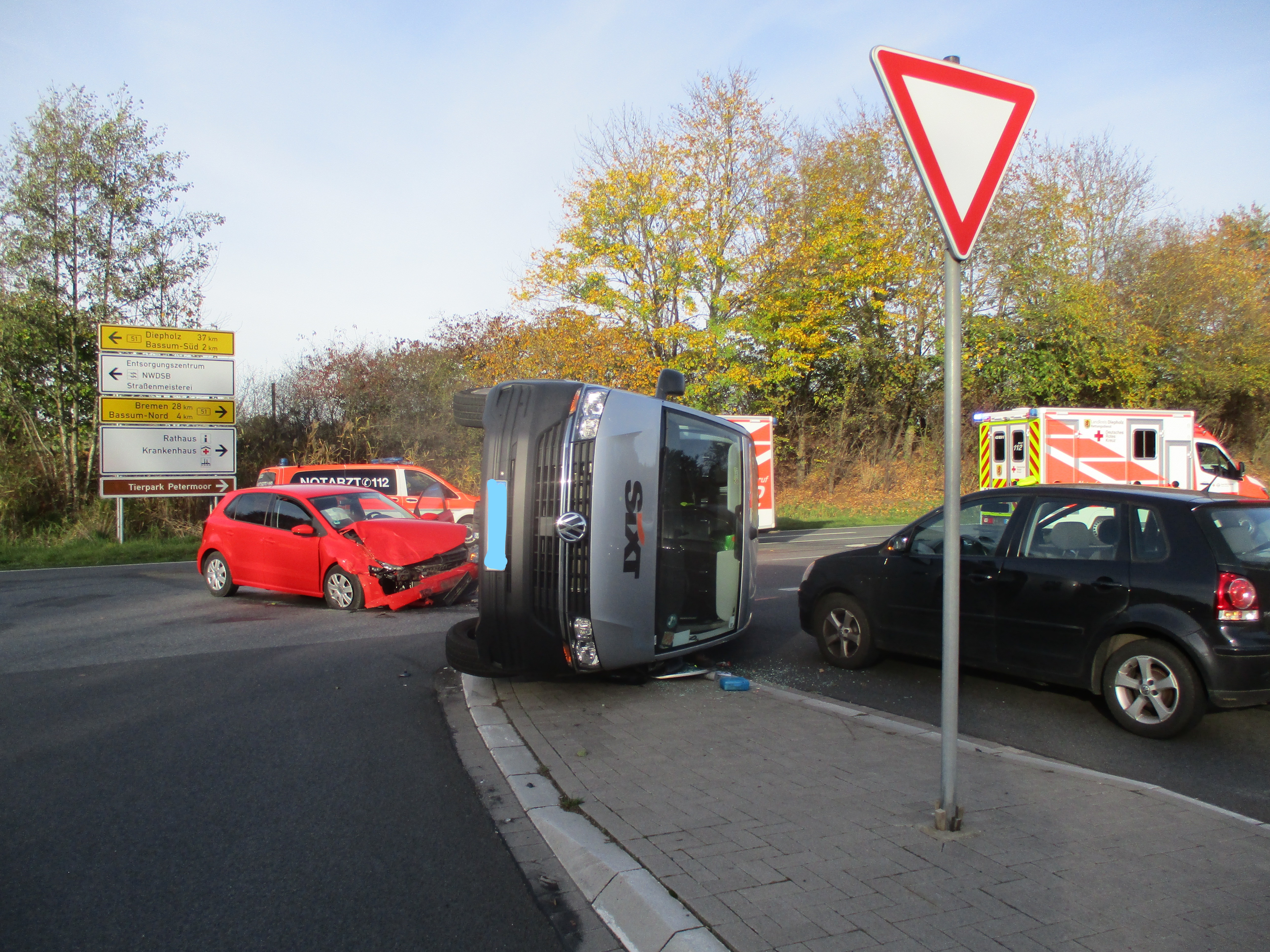 Der Fahrer eines Transporters befuhr die Ortsumgehung Bassum (B 51) in Richtung Süden. An der Einmündung B 61 wollte er nach links in Richtung Sulingen abbiegen. Beim Abbiegen übersah er den entgegenkommenden Pkw VW-Polo. Beide Fahrzeuge kollidierten, wobei der Transporter auf die Seite kippte. Die beiden Fahrer wurden mit Verletzungen vom Rettungsdienst ins Krankenhaus gebracht. Die Fahrzeuge waren nicht mehr fahrbereit und mussten abgeschleppt werden.