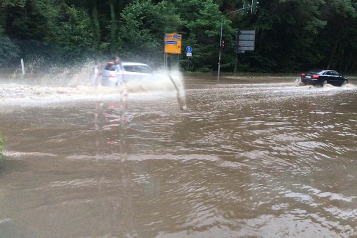 Annähernd alle Bäche im Stadtgebiet sind durch die extremen Regenmengen über die Ufer getreten und haben umliegende Grundstücke und Gebäude überflutet