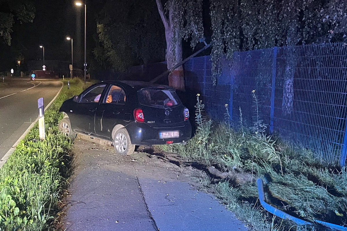 Das Fahrzeug geriet dann auf den Gehweg und kollidierte mit einer Laterne, einem Haltestellenschild einer Bushaltestelle und einem Zaun.