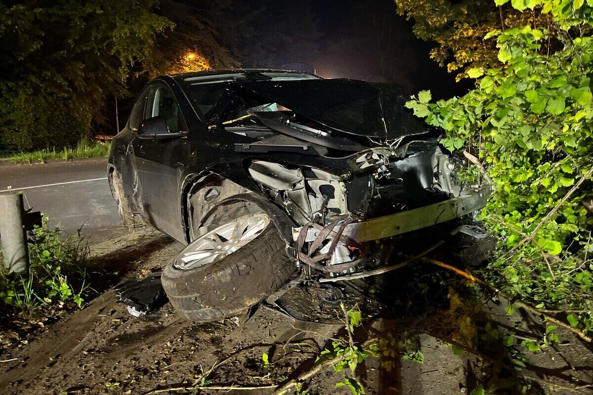 In der Nacht auf Donnerstag, 09.05.2024, ist ein betrunkener Tesla-Fahrer von der Dornberger Straße abgekommen. Er stürzte die Böschung hinab. Der betrunkene Fahrer blieb unverletzt.