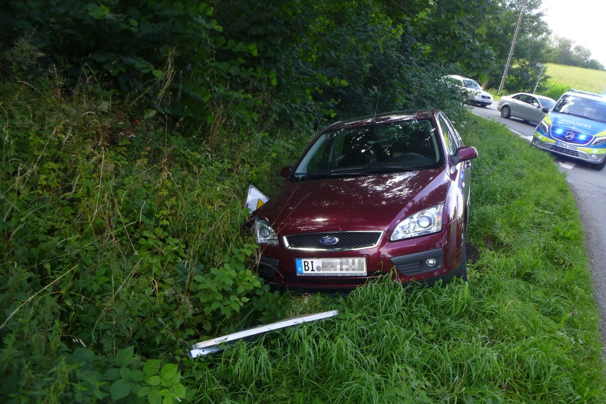 Ein 50-jähriger Bielefelder fuhr gegen 15:35 Uhr auf der Dornberger Straße stadteinwärts. An der Einmündung der Bergstraße geriet er mit seinem Pkw Ford Focus nach rechts von der Fahrbahn ab. Dabei überrollte das Auto einen Leitpfosten und zwei Verkehrszeichen. Der Ford kam schließlich in der Straßenböschung zum Stillstand.