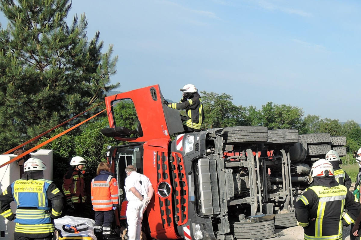 Vor Ort wurde festgestellt, dass ein Baustellen LKW umgekippt war und auf der Beifahrerseite lag. Der Fahrer war nach dem Sturz in der Fahrerkabine eingeschlossen. Die Feuerwehren schafften mit einer Steckleiter, über die Fahrertüre einen Zugang zu dem Fahrer. Für die Rettung des Patienten wurde die Windschutzscheibe aus dem Fahrzeug entnommen. Hierzu wurde die Scheibe mit einer Glassäge ausgesägt. Außerdem nahmen die Feuerwehren die austretenden Betriebsstoffe auf und stellten den Brandschutz sicher. Nach 2,5 Stunden war der Einsatz für die Feuerwehren beendet.