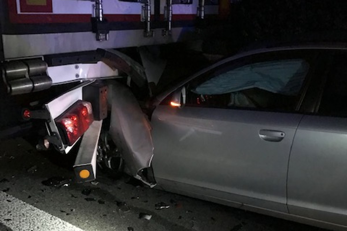 Verunfallter PKW unter dem LKW. (Bildquelle: Feuerwehr Bottrop)