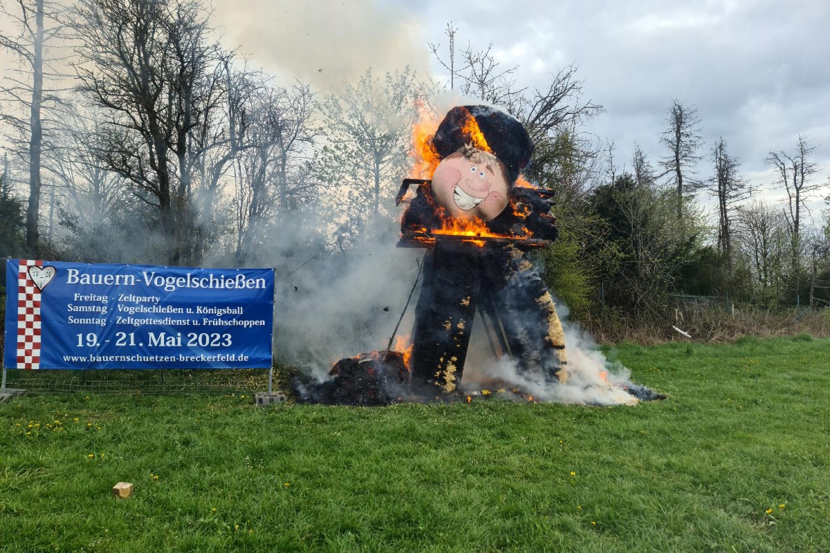Am Montagmorgen (01.05.2023) wurden der Feuerwehr Breckerfeld brennende Strohballen am Wengeberg gemeldet. Die aus Strohballen bestehende Figur, die auf das bevorstehende Bauernvogelschießen in der Hansestadt hinweist, stand in Flammen.