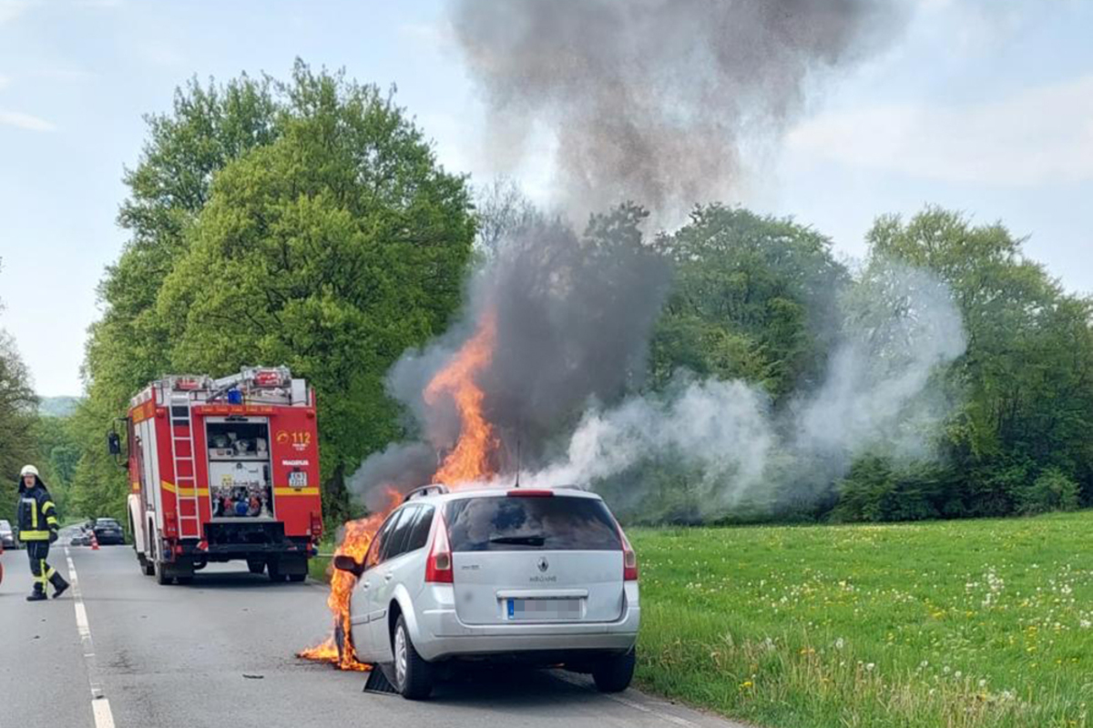 Am Samstagmorgen wurde die Feuerwehr Breckerfeld zu einem PKW-Brand auf der Brantener Straße alarmiert. Bei Eintreffen stand das Fahrzeug bereits in Vollbrand.