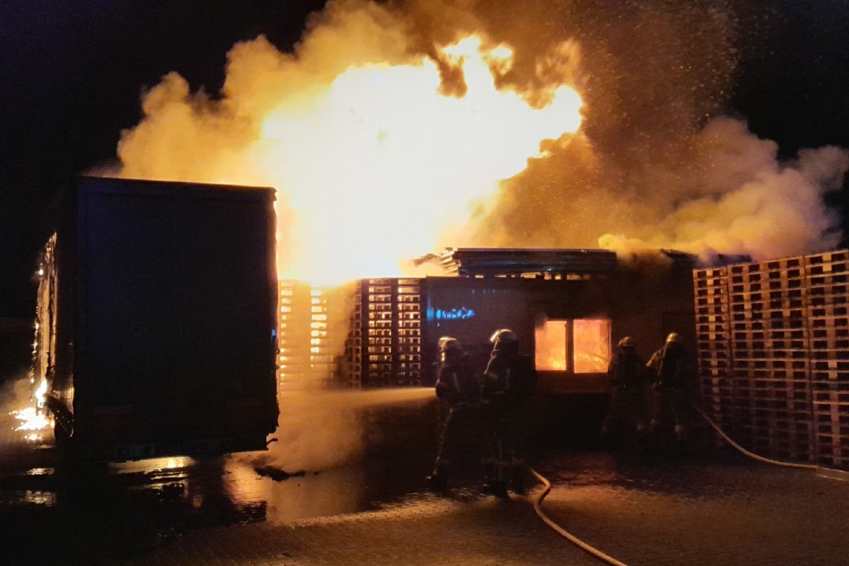 Auf einem Firmengelände brannte ein LKW sowie angrenzend gelagerte Paletten auf einer Fläche von ca. 100 m². Durch den Wind hatte das Feuer bereits auf sechs weitere abgestellte Container übergegriffen.