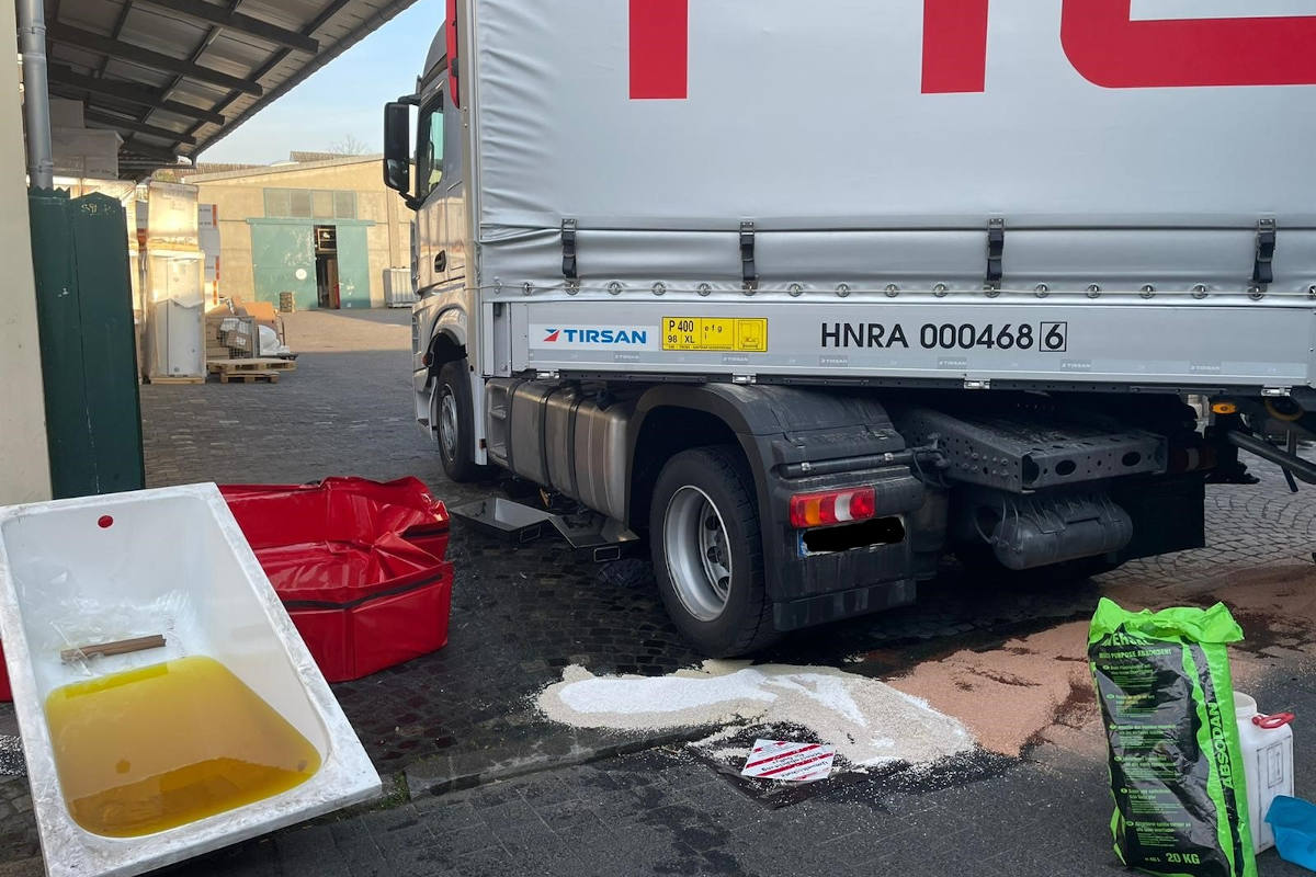 Dort hatte sich ein LKW mit Sattelauflieger bei der Einfahrt zu einem Betriebsgelände den Dieseltank aufgerissen. Bis zum Eintreffen der Einsatzkräfte lief bereits ca. 800 Liter Diesel in den Mischwasserkanal der Straße. Die Feuerwehr verhinderte ein weiteres Auslaufen und pumpte anschließend die Reste aus dem Tank.