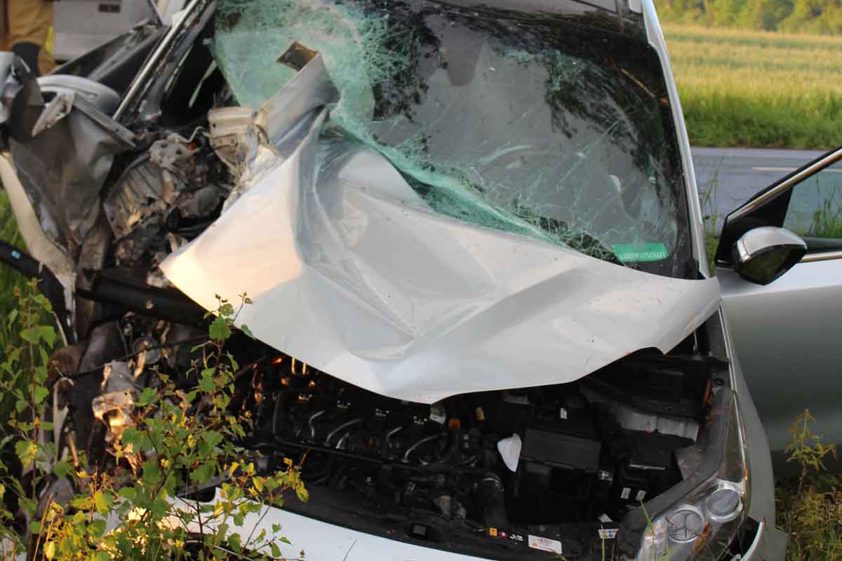 An der Unfallstelle gerät er nach rechts von der Fahrbahn ab und prallt gegen einen Straßenbaum. Der Pkw-Fahrer befreit sich selbst aus dem im Frontbereich stark deformierten Pkw Kia.