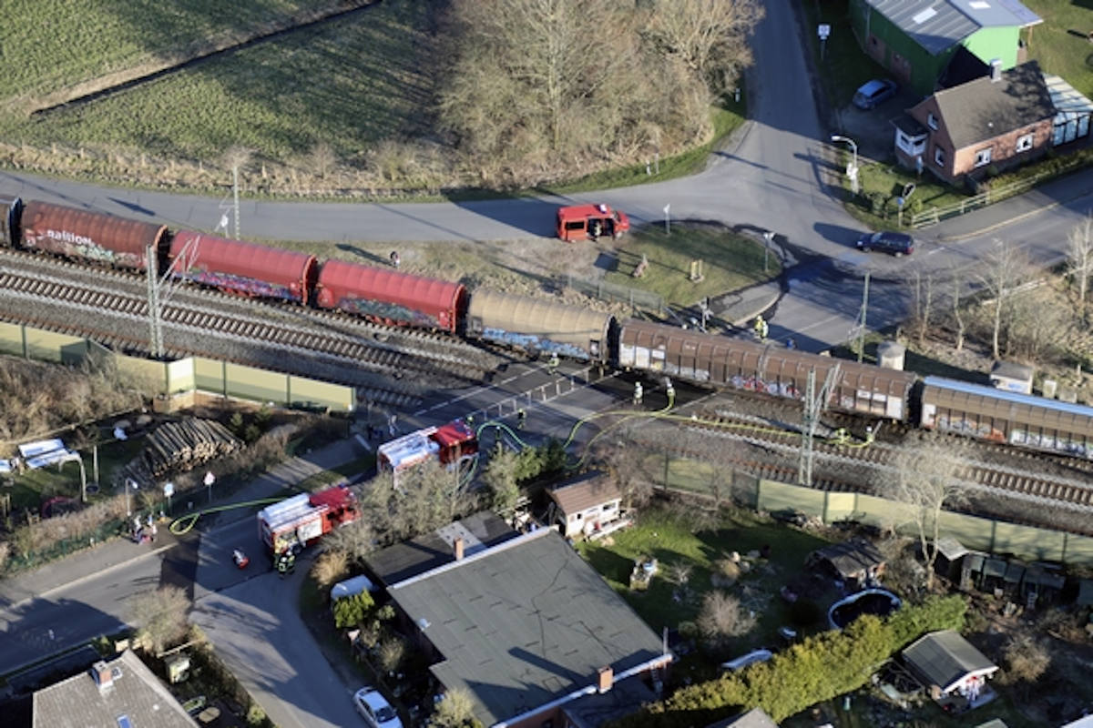 Gestern Nachmittag wurde die Bundespolizei über einen brennenden Güterzug auf der Bahnstrecke Neumünster nach Hamburg informiert. Die Bahnstrecke wurde zwischen Wrist und Neumünster gesperrt.