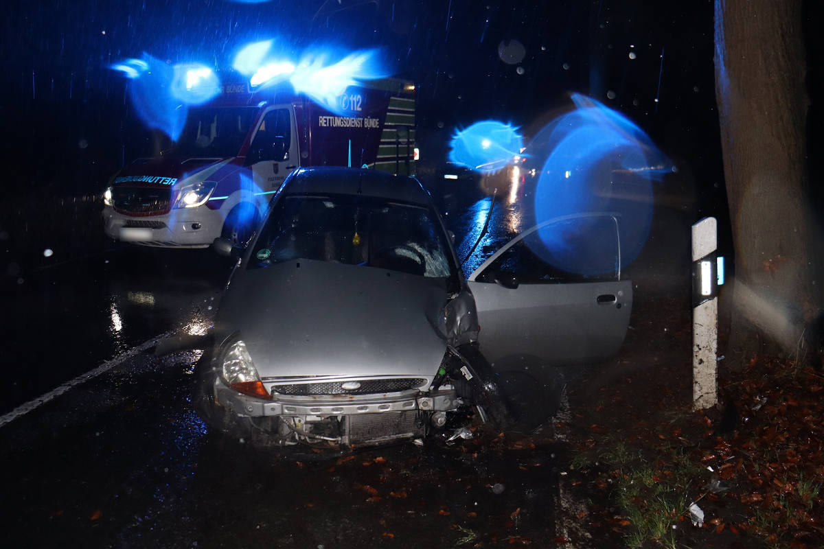 Nach bisherigen Ermittlungen befuhr ein 28-Jähriger aus Kirchlengern die Dünner Straße in Richtung Bünde Innenstadt. Etwas 200m nach der Einmündung der Bäderstraße kam er aus bislang unbekannten Gründen mit seinem silbernen Ford Ka nach rechts von der Fahrbahn ab. Hier schleuderte er über einen Grünstreifen und landete letztendlich gegen einen Baum.