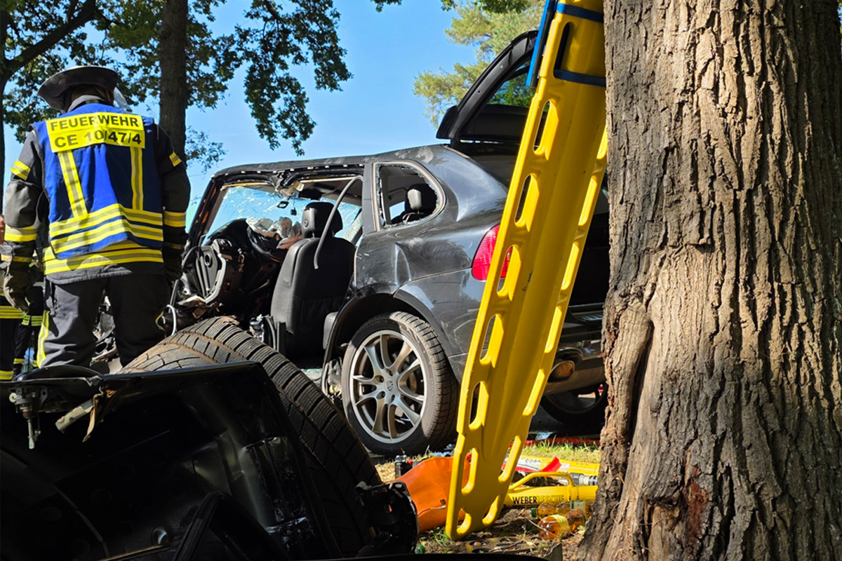 Ein Autofahrer wurde am Freitagmittag (19.09.2025) bei einem Unfall auf der Hannoverschen Heerstraße in Celle schwer verletzt. Der Porsche prallte gegen einen Baum, der Mann wurde im Beinbereich eingeklemmt und musste von der Feuerwehr aufwendig befreit werden.