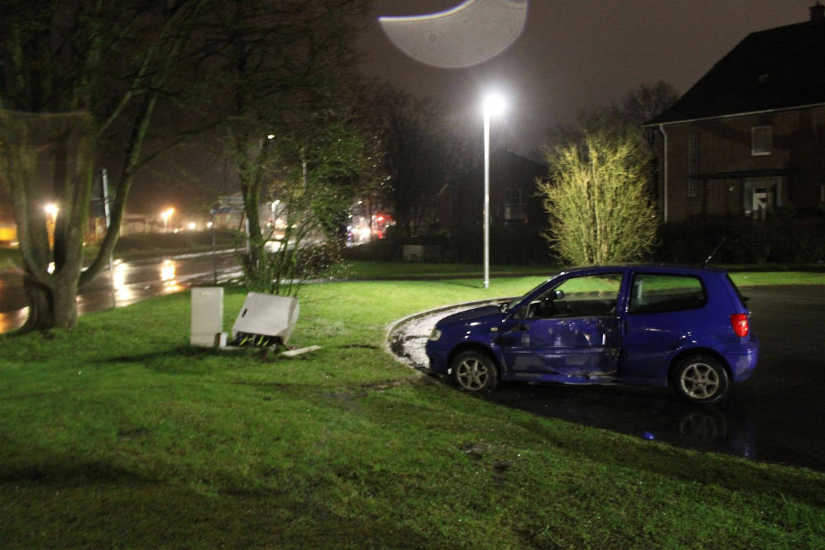 Aus noch nicht geklärten Gründen rammte er ein Verkehrszeichen, verlor die Kontrolle über das Auto, rutschte von der Fahrbahn über einen Grünstreifen und kollidierte mit einem Stromkasten an der angrenzenden Neutorstraße. Daraufhin fiel im Nahbereich der Strom aus. Der leicht verletzte Mann begab sich auf Wunsch selbständig zu einem Arzt. Die Stadtwerke kümmerten sich um die Wiederherstellung der Stromversorgung.