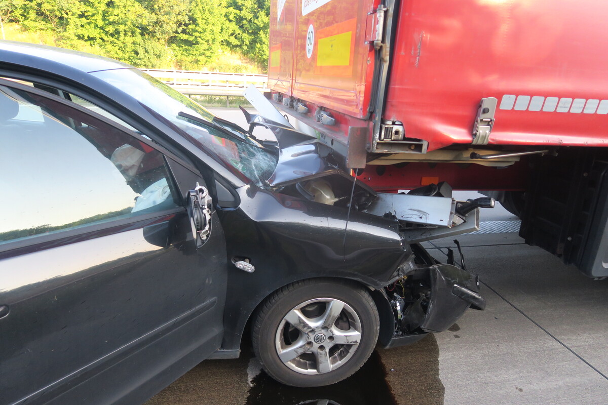 Der Fahrer des Sattelzugs, ein 40-jähriger Mann aus der Slowakei, nahm in diesem Moment einen technischen Defekt an und brachte den Sattelzug einige hundert Meter weiter auf dem Standstreifen zum Stillstand. Hier wurde er auf den Pkw aufmerksam, der sich in den Sattelanhänger verkeilt hatte.
