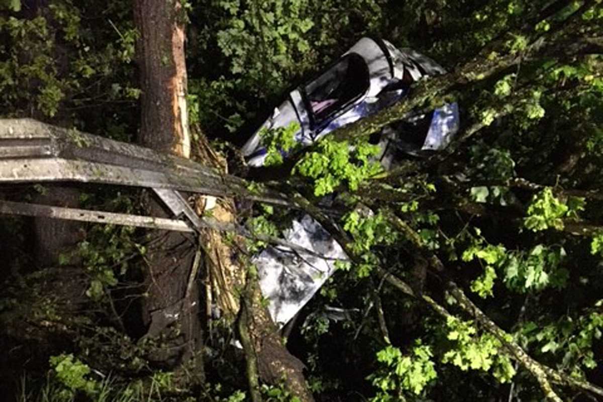 Aus bisher ungeklärter Ursache kam gestern der PKW von der Fahrbahn ab. Er kam in der Böschung an einen Baum gelehnt auf der Fahrzeugfront zum stehen.