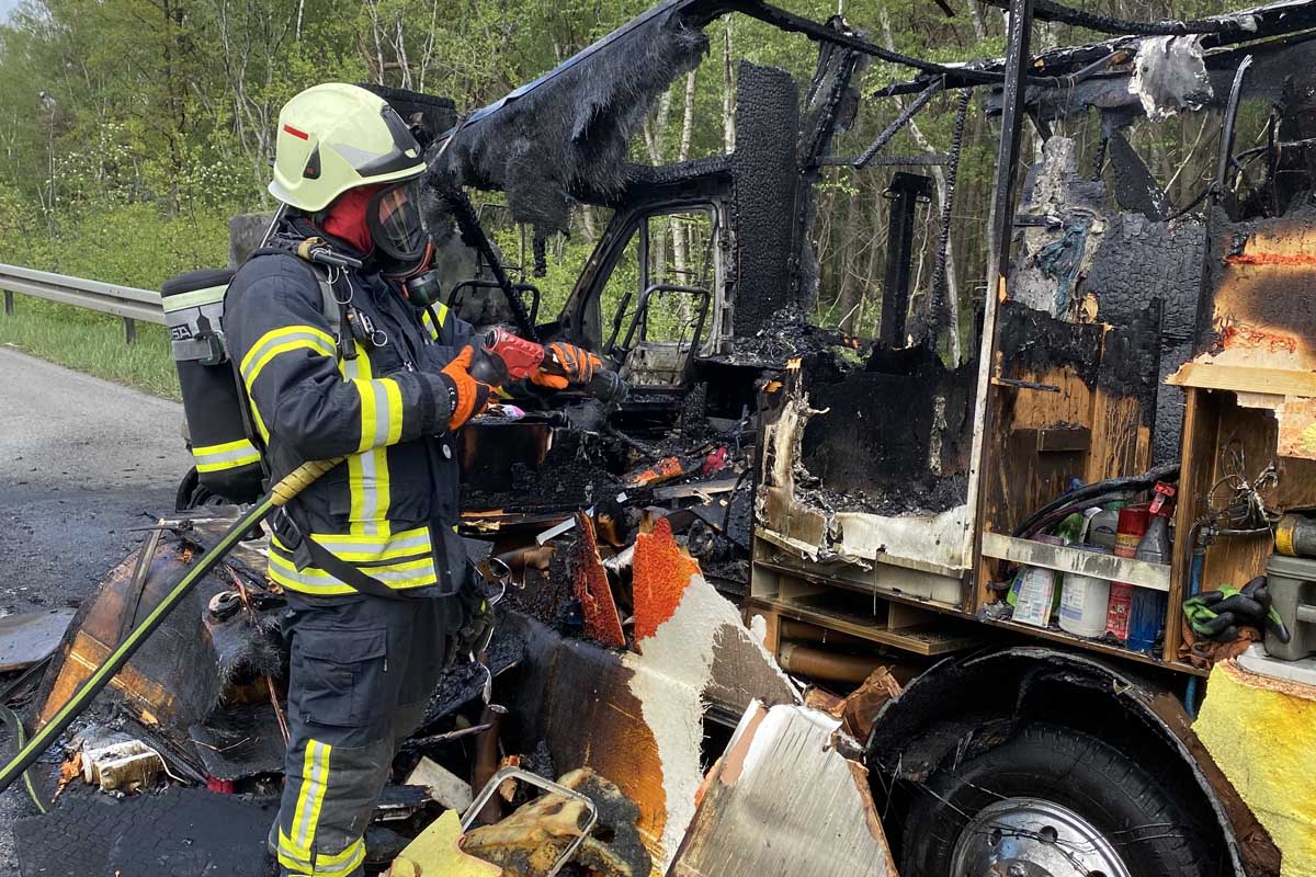Geistesgegenwärtig entnahm er noch die beiden mitgeführten Gasflaschen. Bei Eintreffen der Einsatzkräfte stand das Wohnmobil bereits in Vollbrand. Dieser konnte durch die Feuerwehr dann schnell mit zwei Angriffsrohren unter Kontrolle gebracht werden.