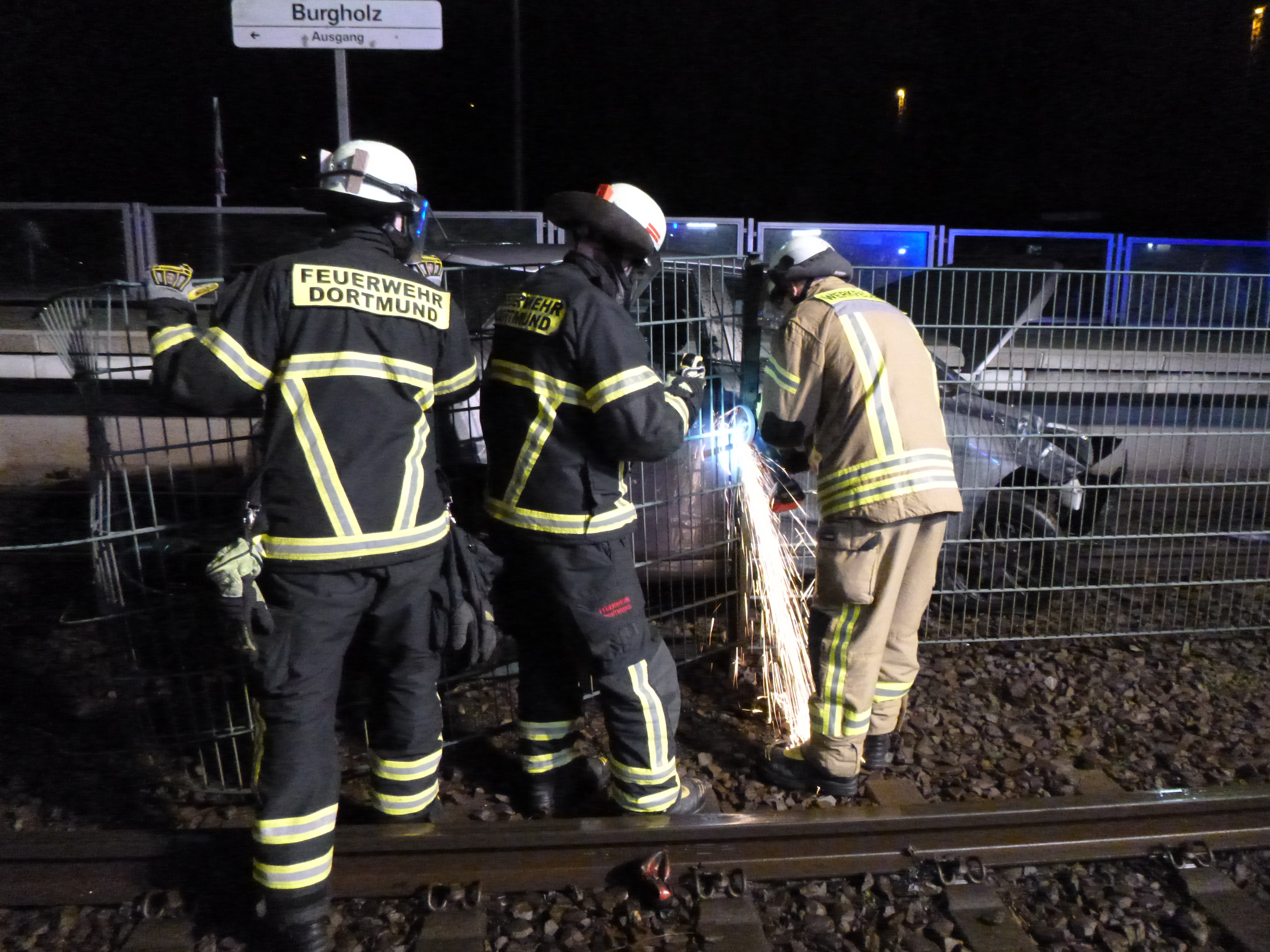 Die Bergung des PKW gestaltete sich etwas komplizierter, da Teile des Zaunes mit dem Fahrzeug verkeilt waren. Die Feuerwehr leuchtete die Einsatzstelle mit einem Lichtmast aus, stellte den Brandschutz sicher und entfernte mehrere Teile des Zauns mit elektrischem Werkzeug. Für die gesamte Einsatzdauer war die Derner Straße in Richtung Stadtmitte gesperrt. Auch die Stadtbahn konnte in dieser Zeit den Abschnitt nicht befahren, da für die Bergung des PKW die Oberleitung stromlos geschaltet werden musste.