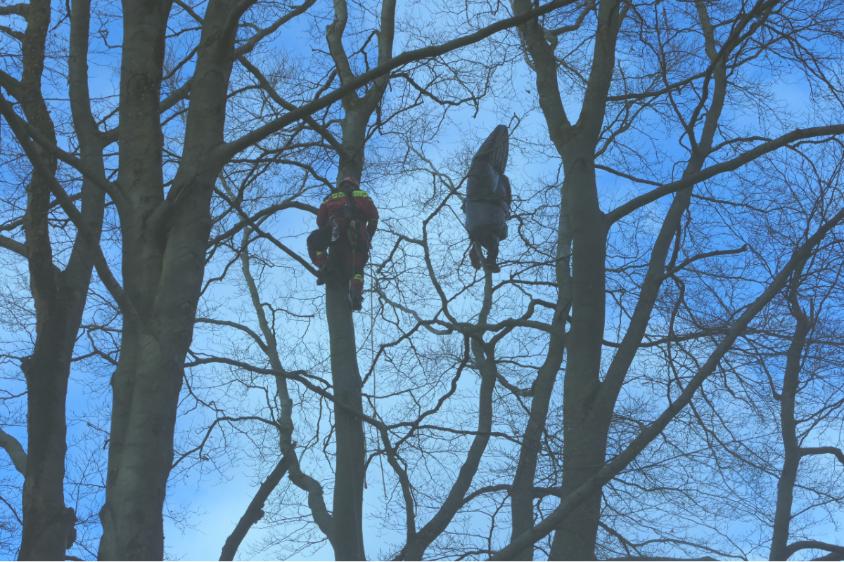 Nachdem klar war, dass der Pilot gesichert war, wurde er unterstützt durch die im Baum befindlichen Höhenretter abgeseilt und dem Rettungsdienst übergeben.