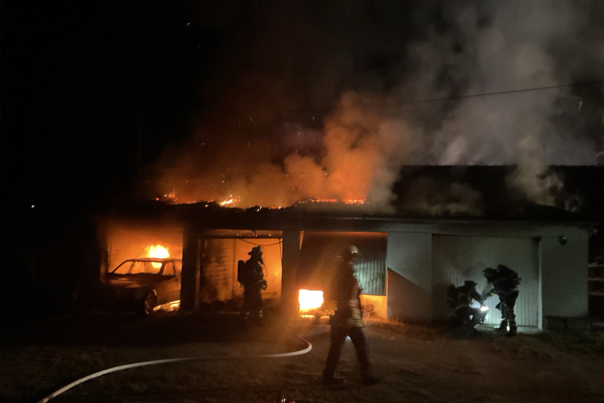Beim Eintreffen der ersten Kräfte stand in einer Garage ein Pkw in Vollbrand und die Flammen griffen bereits auf benachbarte Garagen über.