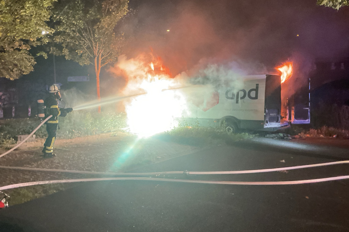 Auf einem Parkplatz brannte ein Lieferwagen eines Paketdienstes in voller Ausdehnung.