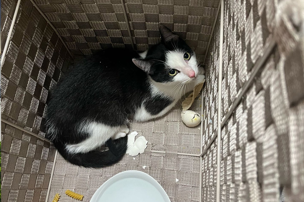 Beim Öffnen des Korbes fanden die alarmierten Polizeikräfte eine verängstigte Katze, die weder mit Wasser noch mit Futter versorgt war.