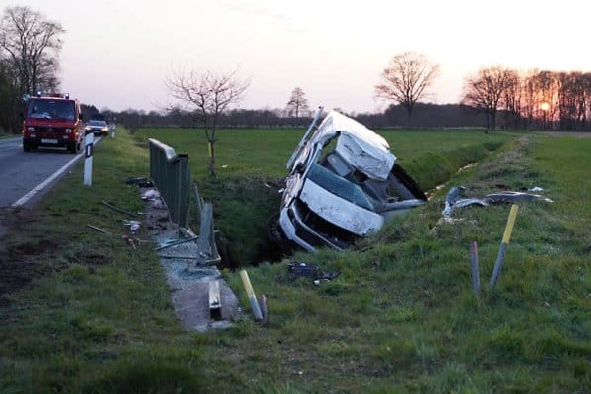 Der schwer verletzte Fahrer wurde durch Zeugen neben dem Transporter am Grabenrand schwer verletzt vorgefunden und mit einem Rettungshubschrauber in einer Spezialklinik nach Hamburg geflogen.