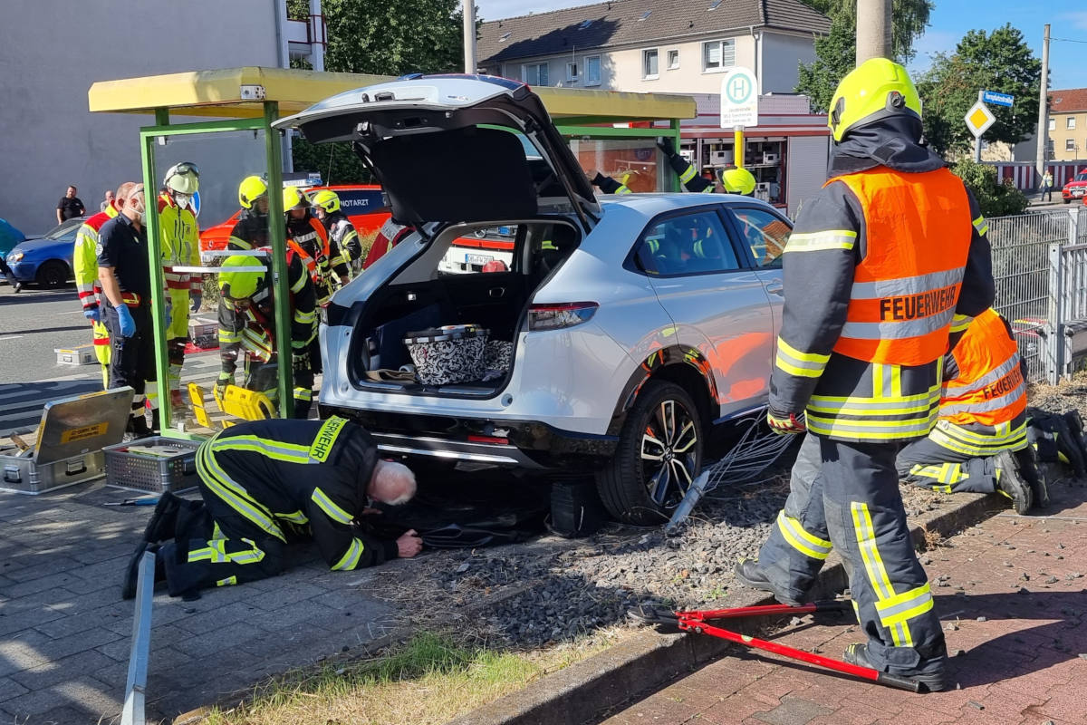 Die Rettung gestaltete sich schwierig, da der PKW auf dem Bürgersteig zwischen einem Wartehäuschen der Stoag und dem Begrenzungszaun zum Stehen kam. Es mussten zuerst Teile des Wartehäuschens demontiert werden um an die eingeklemmte Person zu gelangen. Anschließend konnten Einsatzkräfte der Feuerwehr das Fahrzeug mittels Hebekissen anheben und die verletzte Frau befreien. Sie wurde dem Rettungsdienst übergeben und von einem ebenfalls alarmierten Rettungshubschrauber zur weiteren medizinischen Versorgung nach Duisburg in ein Krankenhaus geflogen.