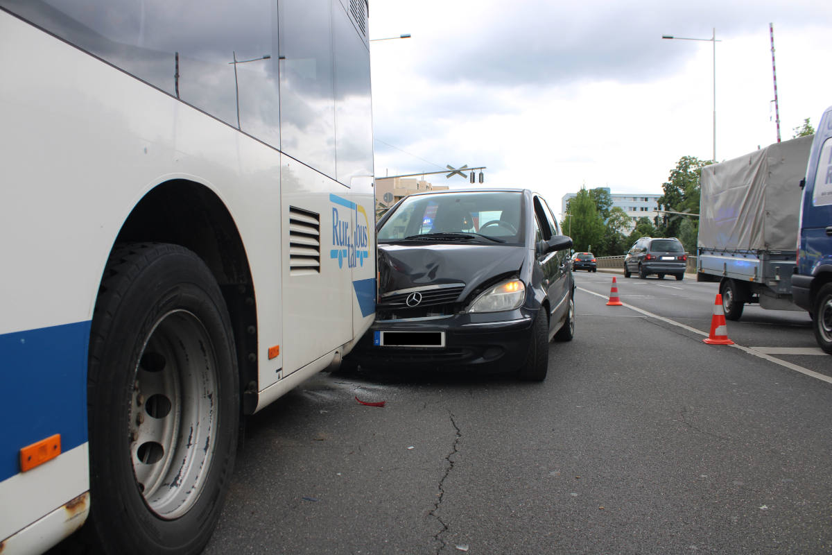 Bei einer innerstädtischen Kollision mit einem Linienbus erlitten am Freitagnachmittag zwei Menschen Verletzungen. Es entstanden temporäre Verkehrsbeeinträchtigungen.
